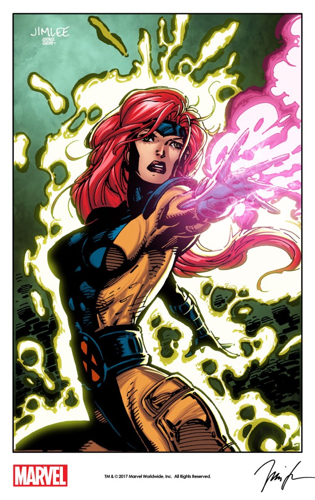 Jean Grey by Jim Lee from Impel’s X-Men Trading Card Series (1992) remastered with digital colors by Israel Silva as a variant cover for Marvel’s X-Men: Blue #7 (2017).